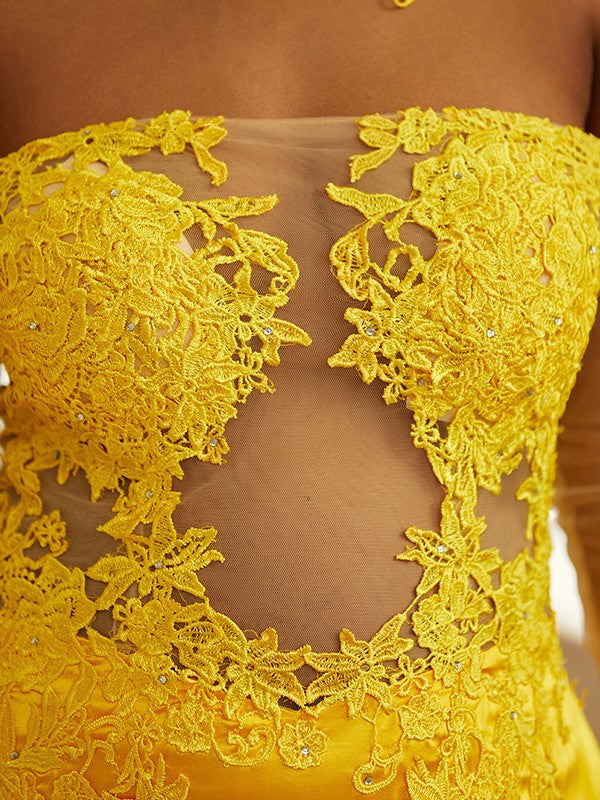 Trumpet/Mermaid Woven Satin Applique Off-the-Shoulder Long Sleeves Sweep/Brush Train Dresses