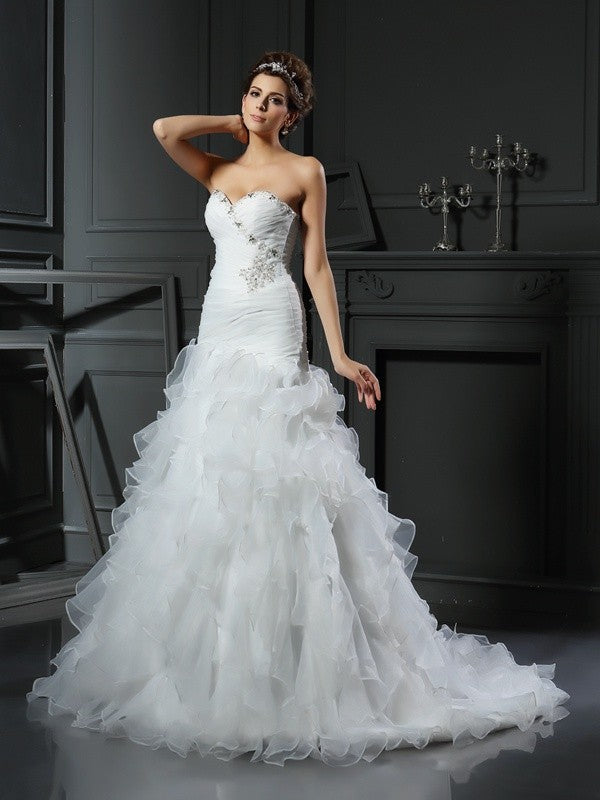 Trumpet/Mermaid Sweetheart Ruffles Sleeveless Long Organza Wedding Dresses