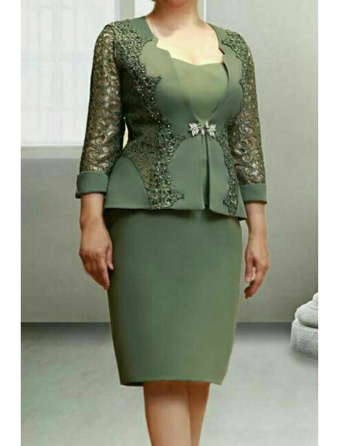 Two Piece Mother of the Bride Dress Wedding Guest Church Party Elegant Scoop Neck Knee Length Stretch Fabric Long Sleeve with Lace Crystal Brooch