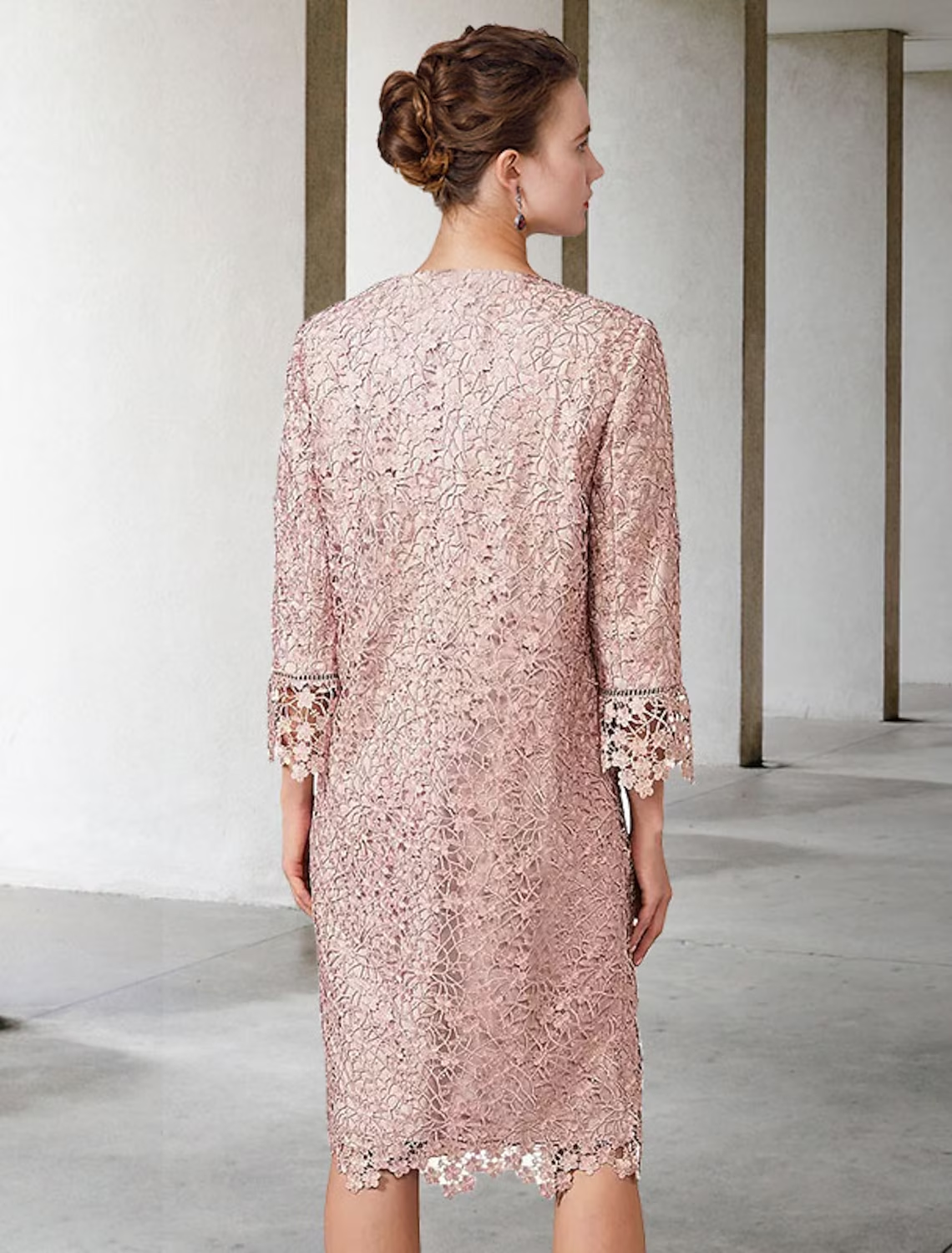 Two Piece Sheath / Column Mother of the Bride Dress Church Elegant Jewel Neck Knee Length Chiffon Lace Short Sleeve Jacket Dresses with Appliques