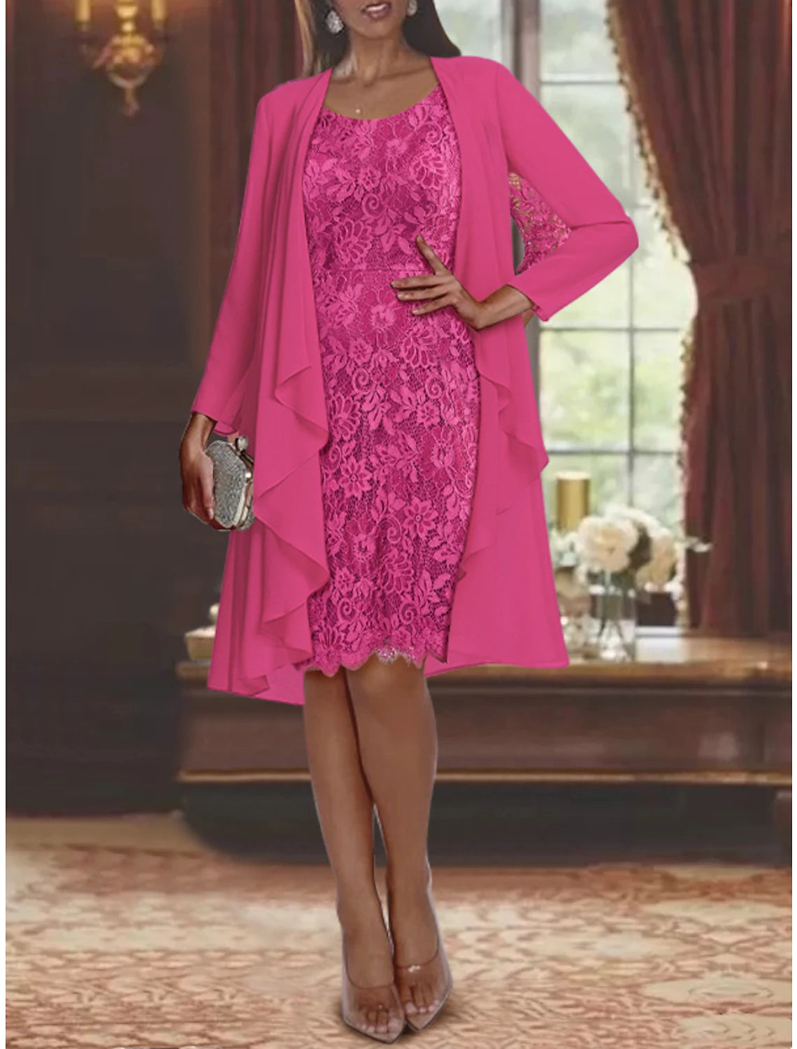 Two Piece Sheath / Column Mother of the Bride Dress Formal Wedding Guest Elegant Scoop Neck Knee Length Chiffon Lace 3/4 Length Sleeve Jacket Dresses with Solid Color Fall