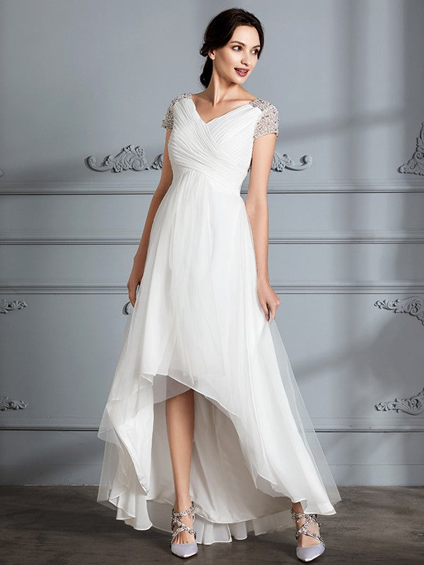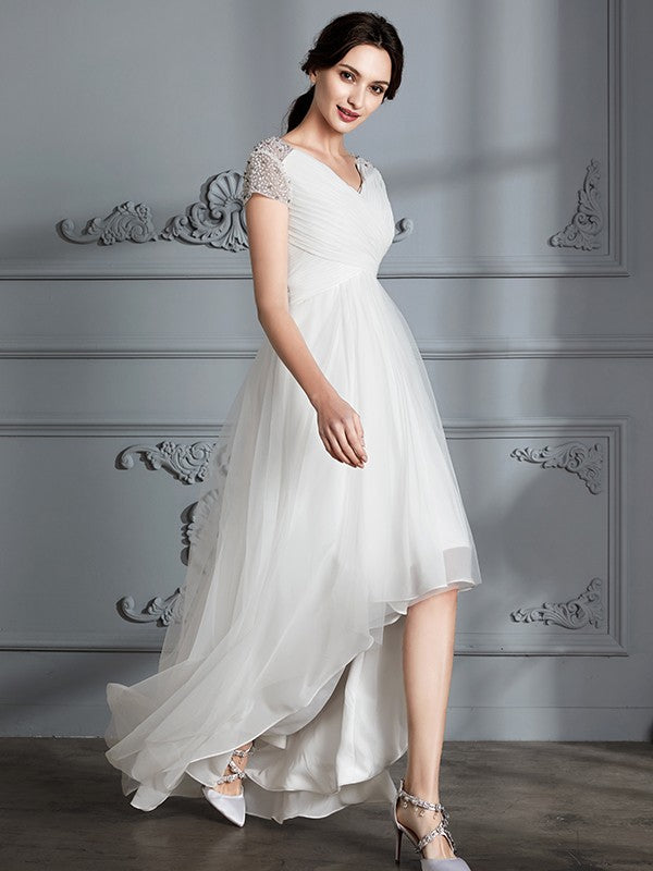 Wedding Dresses Princess V-neck Short Sleeves Asymmetrical Tulle