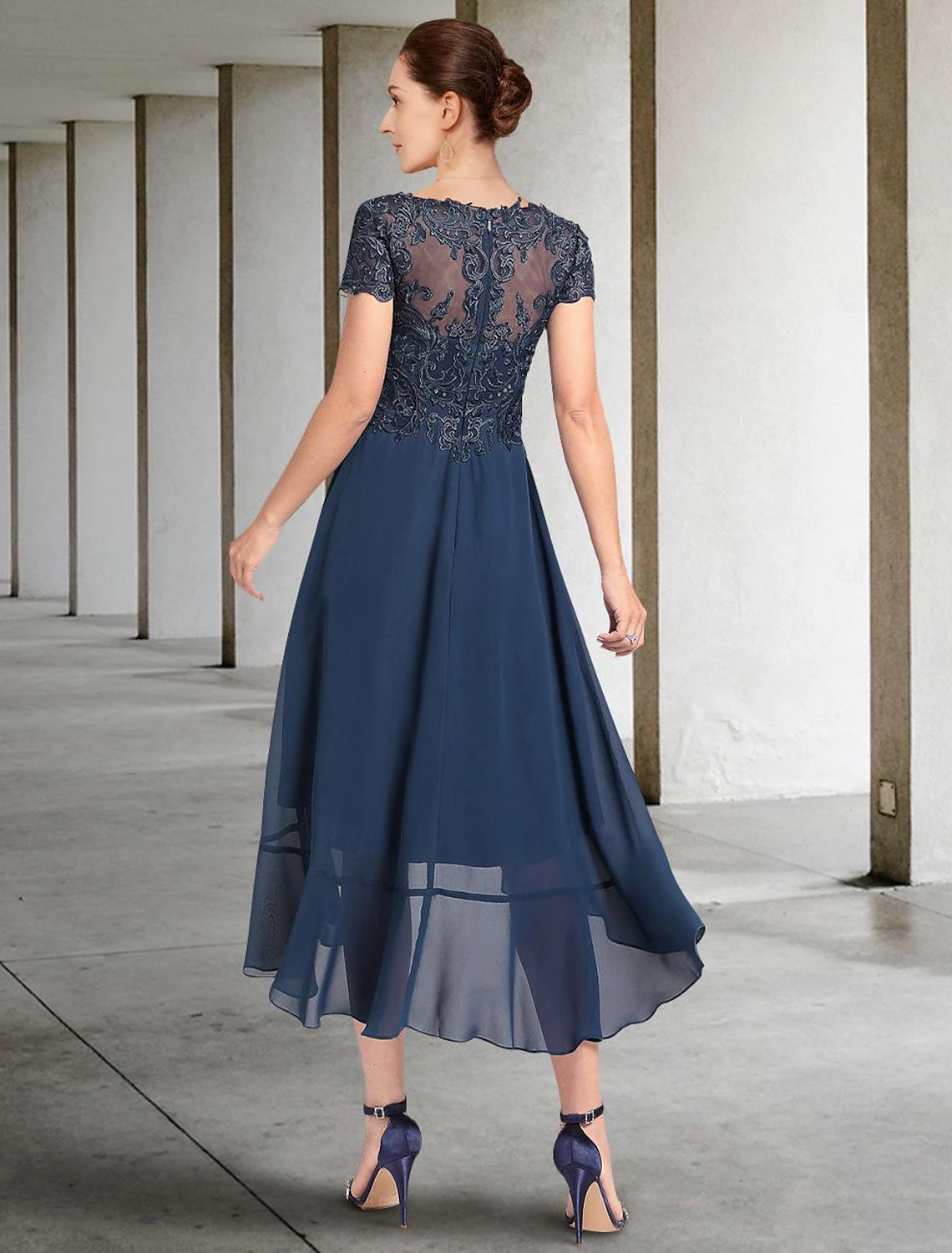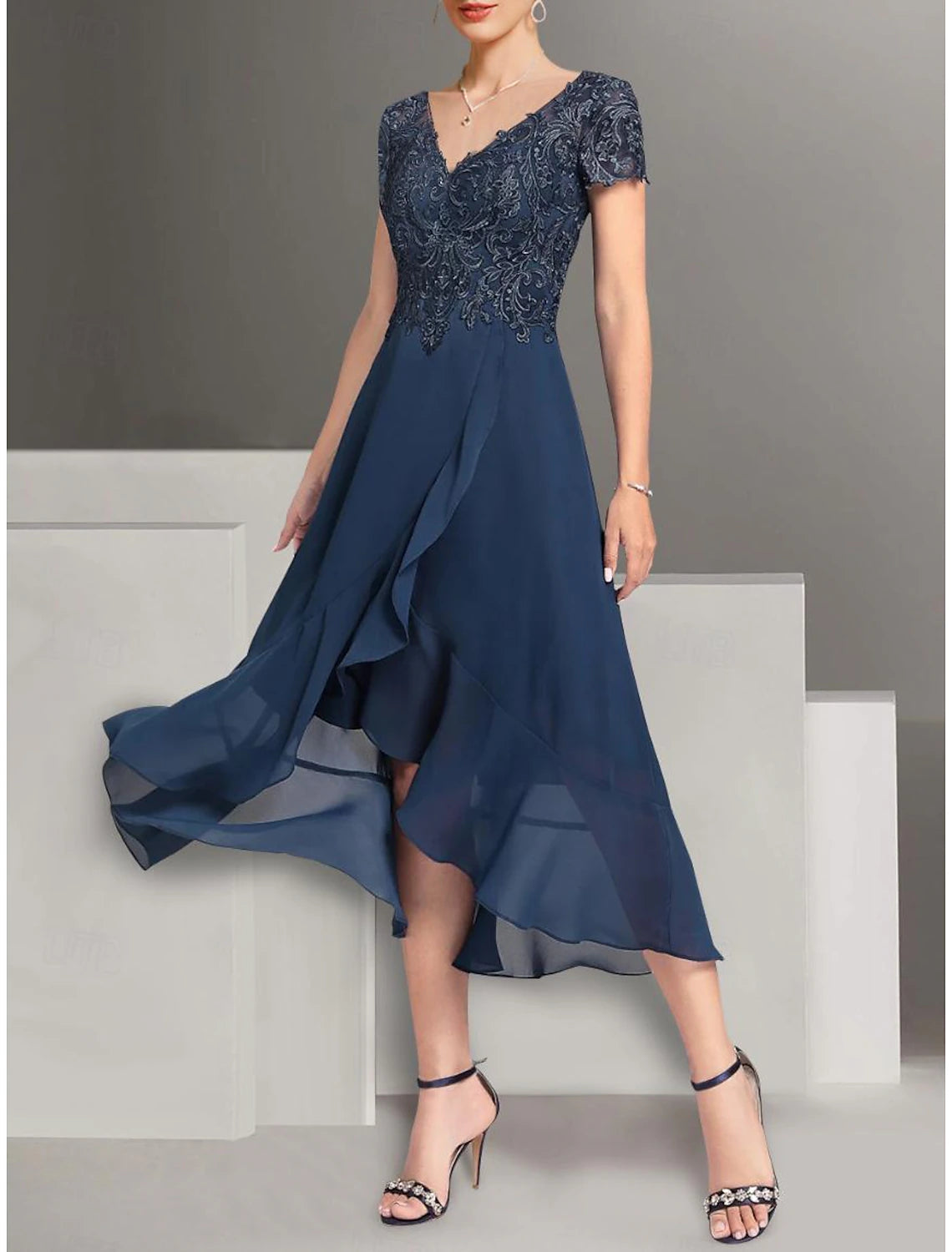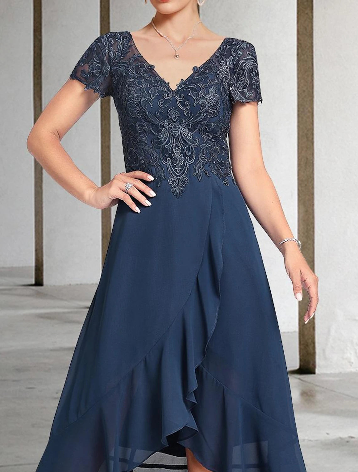 Wedding Guest Dress Elegant High Low V Neck Length Chiffon Lace Short Sleeve with Tier Mother of the Bride Dress